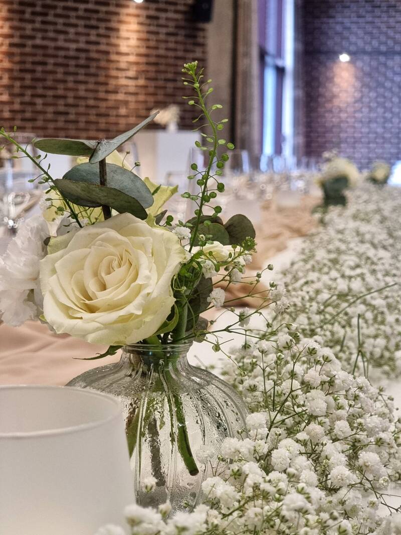 - klein bloemstuk met kleine vaas per tafel